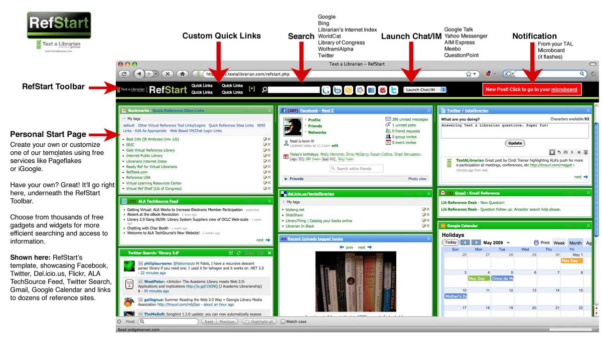 RefStart is a web-based reference application giving librarians customizable one-click access to reference tools, search, web 2.0 sites and popular social networks. As a standard feature of Text a Librarian, RefStart enables librarians to make the most efficient use of time while receiving and responding to patron inquiries.